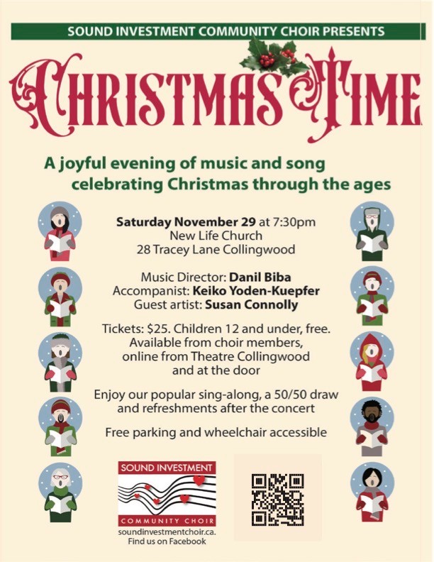 Sound Investment Choir celebrates the festive season with music and song as performed through the ages. Director: Danil Biba. Accompanist: Keiko Yoden-Kuepfer. Guest artist: Susan Connolly. Audience sing-along, 50/50 draw and refreshments.
