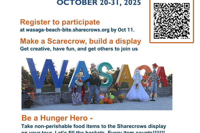 Wasaga Beach Sharecrows Wasaga Beach 2025 October 20 – November 1, 2025 All across Wasaga Beach This is a brand new community-wide event for Wasaga Beach! Hosted by Wasaga Beach Bite, Sharecrows brings together residents, schools, and businesses to create fun and creative scarecrows — Sharecrows — that collect food donations to support our local food bank.